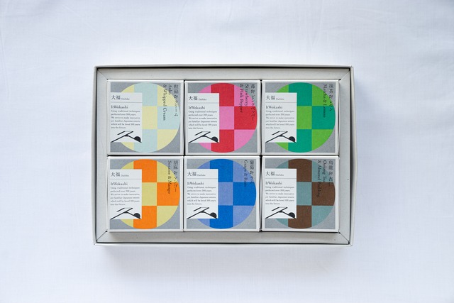 【Daifuku6種セット内容】 ・粒あん&クリーム(1個) ・ごま&マンゴー(1個) ・いちご&ピンクペッパー(1個) ・抹茶&レモン(1個) ・烏龍&杏仁(1個) ・葡萄&ラム(1個) 【お召し上がり方】 ①冷凍のままアイスのように ②解凍して飲めるほどに柔らかく It Wokashiは、「和菓子」や「伝統」というルールに縛られず、自由にお菓子を創造し、和菓子の魅力を現代に合わせてチューニングしながら提案していくブランドです。 It Wokashiというネーミングにも、そんなブランドの思いを込めています。 「いとをかし」の趣深さ、「It お菓子」のアップデートされた和菓子でありたいという思いを込めました。 ◆原材料名 各商品の単品販売ページをご確認ください ◆特定原材料等(アレルギー) 卵・乳成分・大豆・ごま ◆内容量 6個 ※現在6個入の化粧箱が欠品中のため、3個入の化粧箱2箱での発送がある場合がございます。ご迷惑をおかけして申し訳ございません。 ◆消費期限 ・冷凍保管(-18℃以下)→到着日から30日間 ・解凍後の冷蔵保管(10℃以下)→3日以内にお召し上がりください ◆保存方法 冷凍保管(-18℃以下)または冷蔵保管(10℃以下) ◆製造者 (有)小原木本舗大徳屋長久 三重県鈴鹿市白子1丁目6-26 ※複数配送先へお届けをご希望されるお客様 現在、BASEショップのシステム上、 1度の決済でご購入いただいた商品を複数の配送先へ割り振ることができません。 複数配送先へお届けをご希望される場合は、カート画面の配送方法選択にて 「クール宅急便・複数配送」をお選びいただき、まとめて決済をお願いいたします。 配送先ご住所については備考欄、もしくはお問い合わせフォームよりご連絡をお願いいたします。 お手数をおかけしますがよろしくお願いいたします。