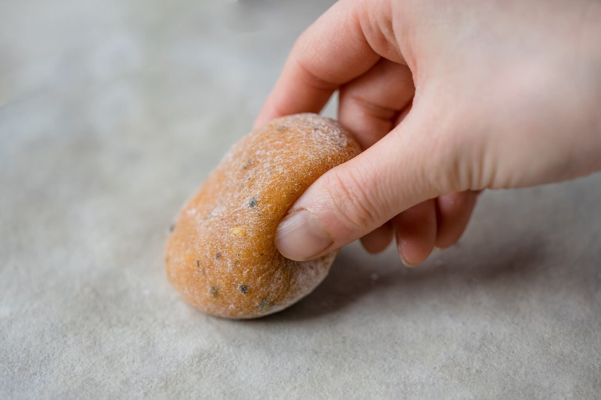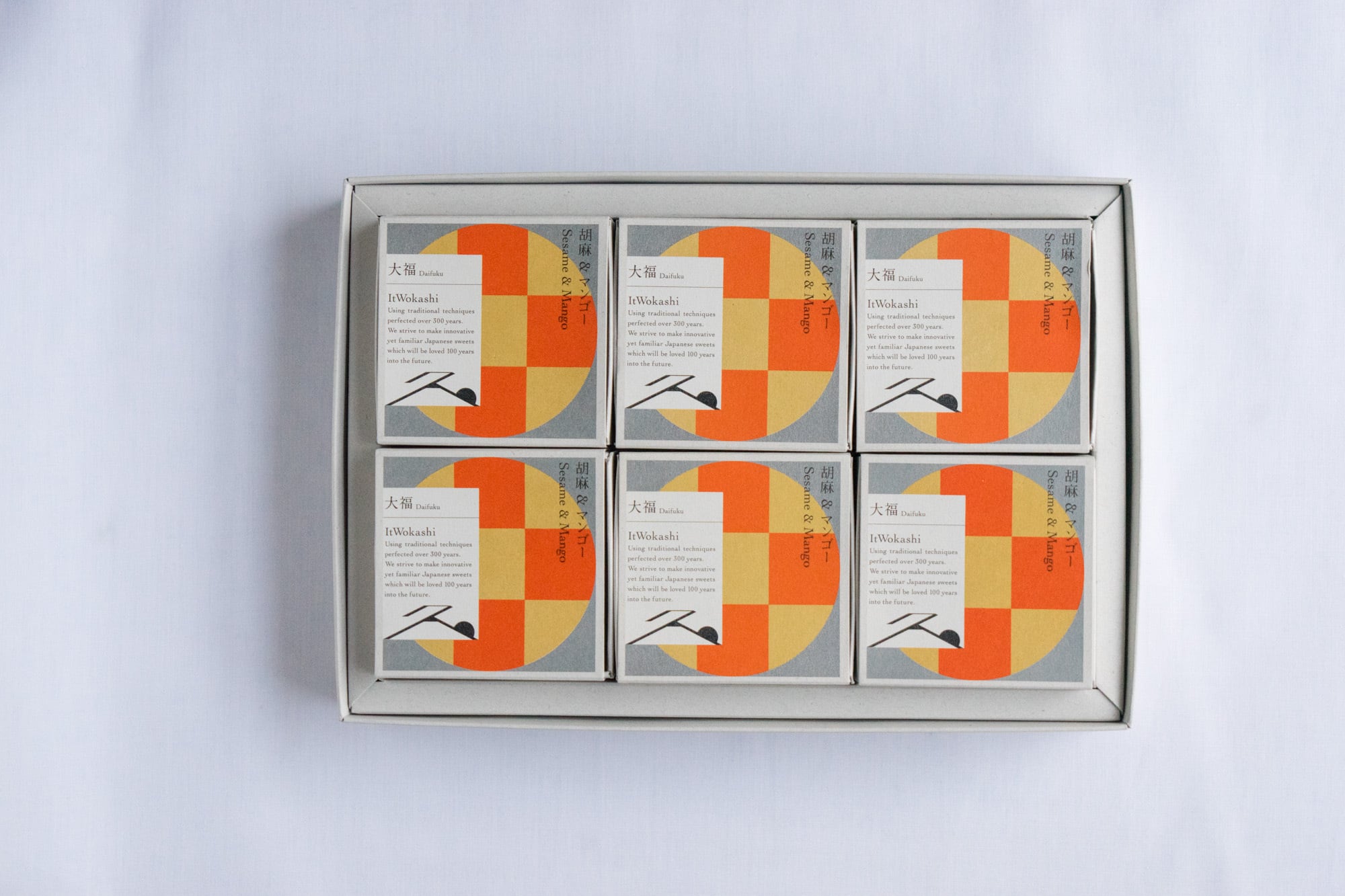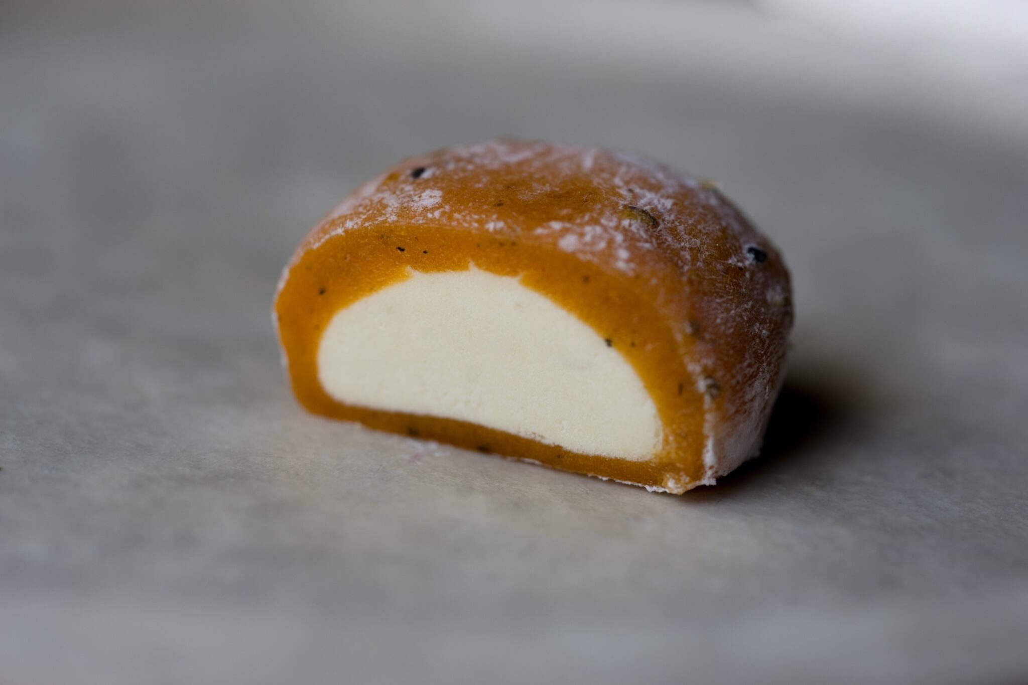 マンゴーピューレを練りこんだクリーム餡を、胡麻を入れた求肥で包んだ大福。夏の一番人気です。