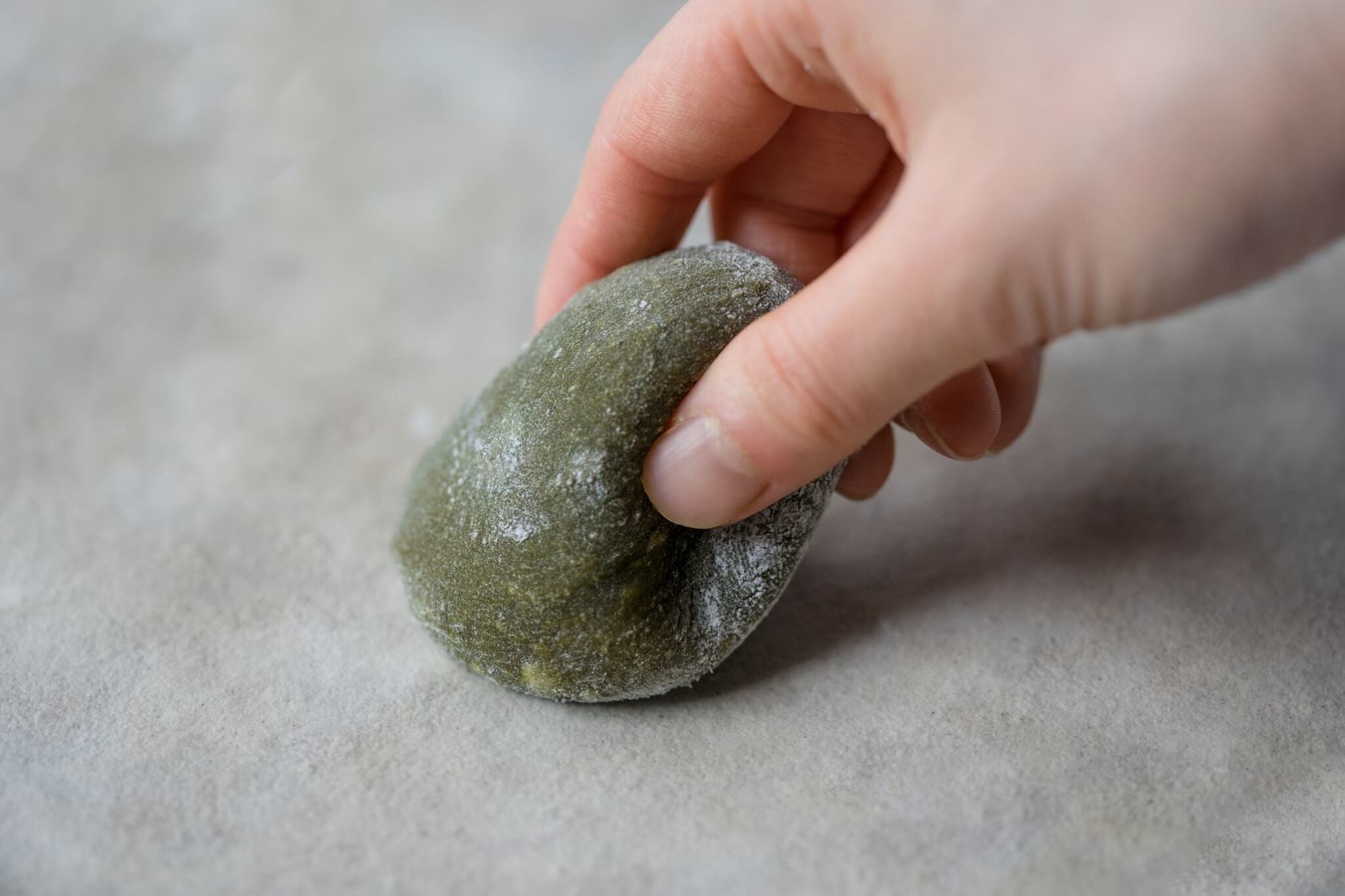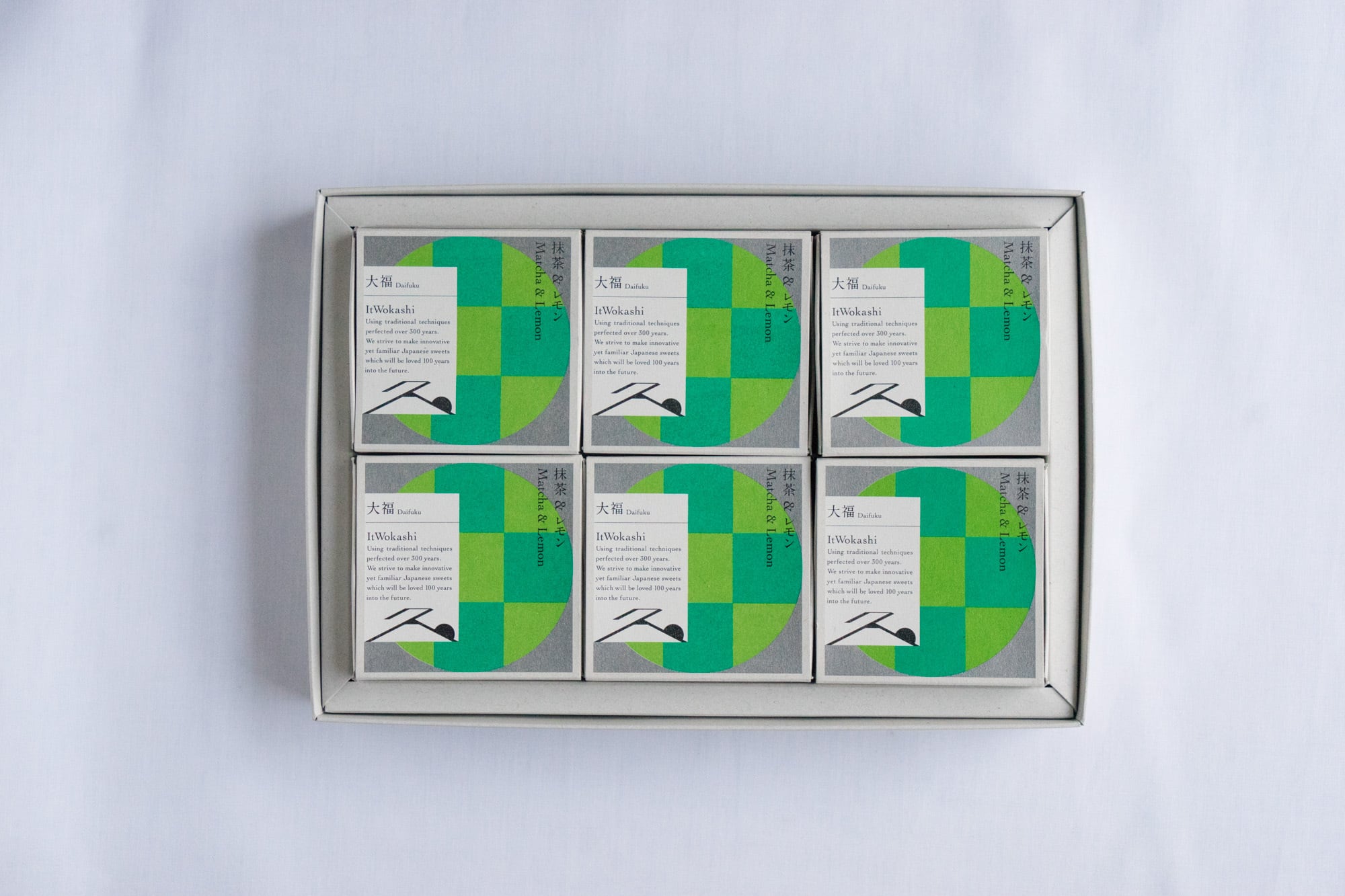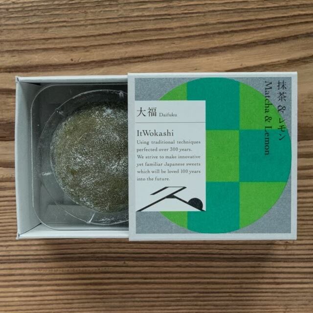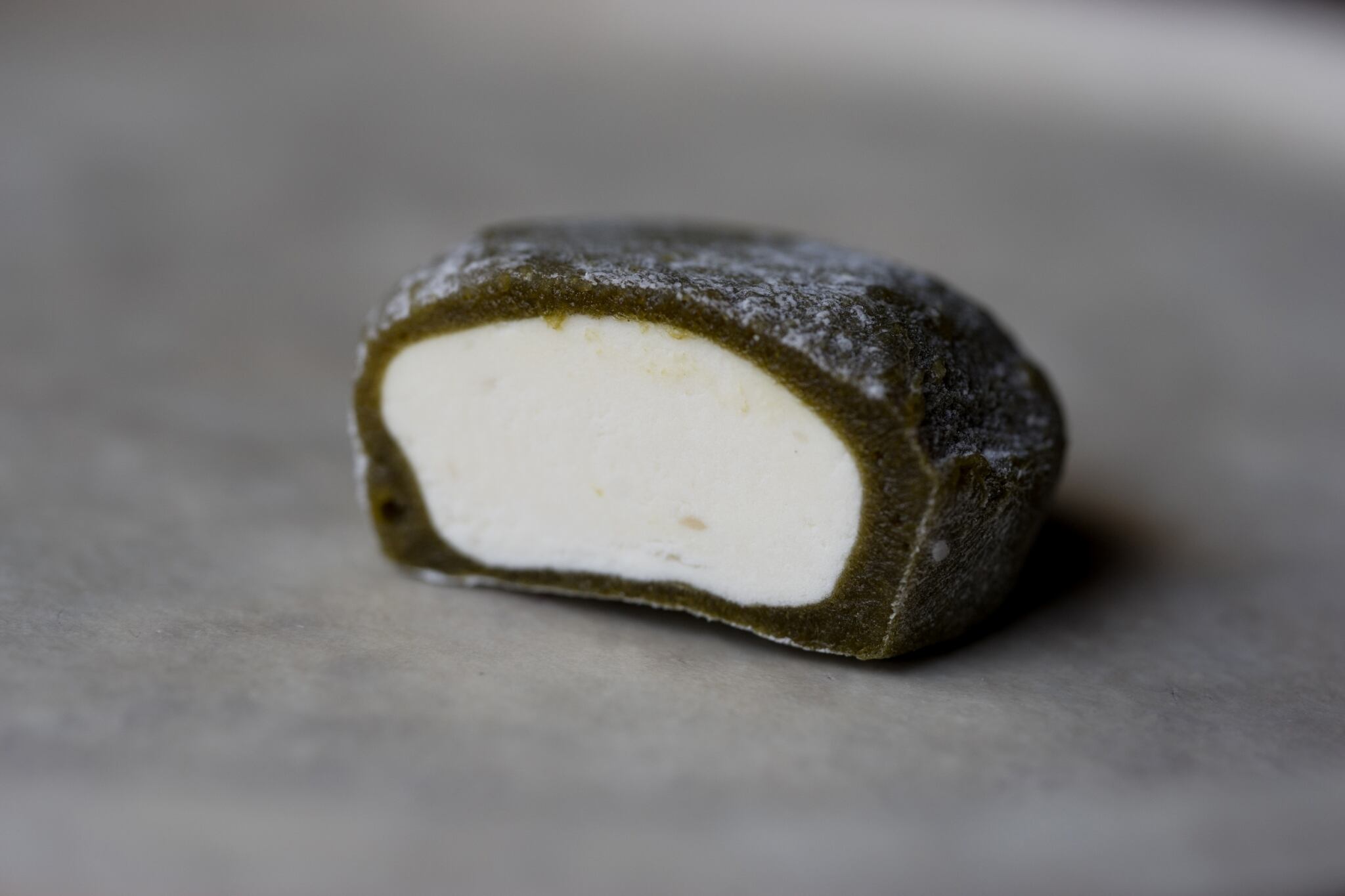 通常レモンより甘みのある「マイヤーレモン」のペーストを練りこんだクリーム餡を、抹茶を練りこんだ求肥で包んだ大福。