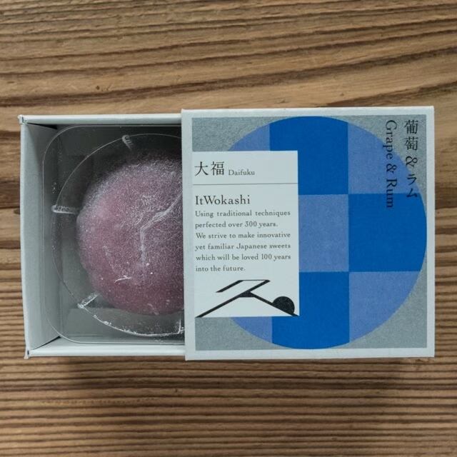 ラムの風味をほんのり効かせレーズンを入れた餡を、葡萄味の求肥で包んだ大人雰囲気の大福です。